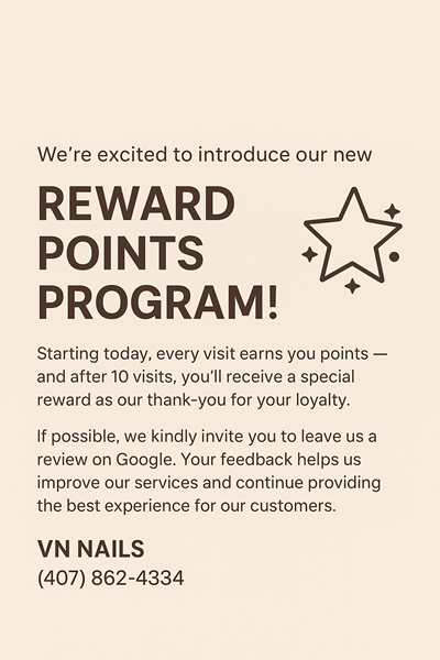 WELCOME TO VN NAILS We are Different? Our Salon offers a unique beauty and wellness journey tailored to your specific well-being needs Featuring natural organic services as well as result-driven treatments, we are committed to providing you with insight into a better, healthier state-being. Our luxurious, modern inspired salon seamlessly balances both your needs and appearance through spectacular spatial offerings including signature spa pedicure and manicure treatments, stunning nail designs, top brand name products, and warm, welcoming space. There is nothing more important to us than your safety and comfort when you visit our salon. That's why we pledge to adhere to the highest industry standards. We sanitize and disinfect all reusable nail tools in accordance with state regulations. Any tools that can't be disinfected are jettisoned. Book an appointment and let's pamper you today!
